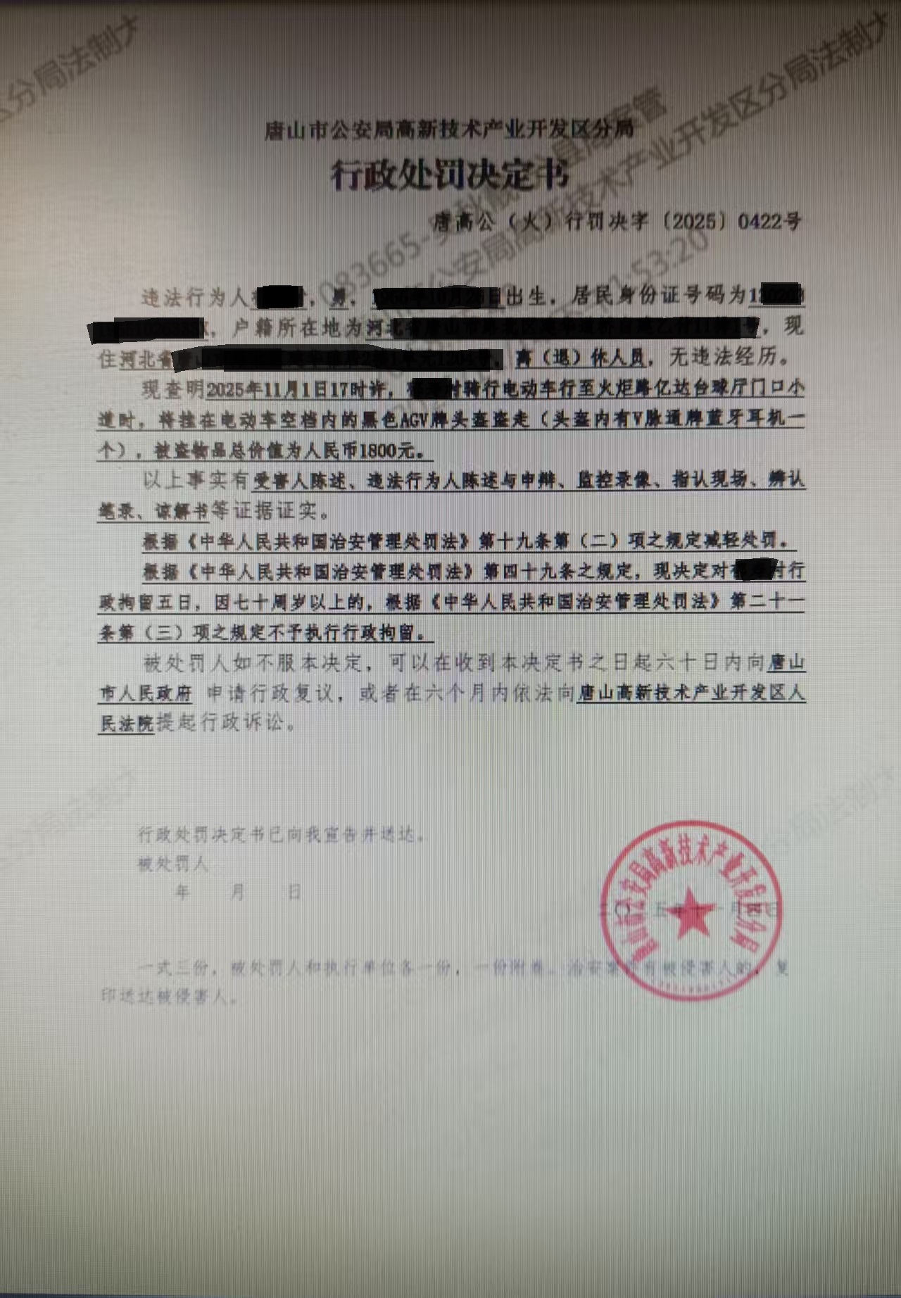 唐高公(火)行罰決字{2025}0422號行政處罰決定書