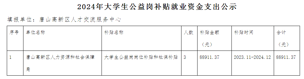 根據河北省財政廳、河北省人力資源和社會保障廳關于印發《河北省就業創業資金管理辦法》的通知(冀財規〔2018〕21號)規定,通過公益性崗位安置就業困難人員并繳納社會保險費的單位,按其為就業困難人員實際繳納的基本養老保險費、基本醫療保險費(含生育保險費)、失業保險費和工傷保險費給予補貼,不包括就業困難人員個人應繳納的部分。崗位補貼標準最高不超過當地最低工資標準。經審核,唐山高新技術產業開發區人力資源和社會保障局申報3名大學生公益性崗位就業困難人員2023年11月-2024年12月社保補貼31711.37元、崗位補貼57200元;合計需從就業補助資金列支88911.37元。現將補貼情況進行公示,公示時間為2025年2月21日至2025年2月23日。