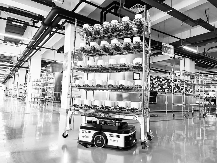 圖為3月26日,在位于唐山高新區的匯中儀表股份有限公司生產車間,一輛AGV物流小車正“頂著”水表貨架自動“奔赴”庫房。陳汝健攝