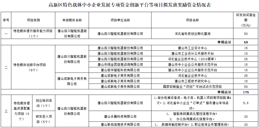 ? ? ? ?根據市財政局《關于下達2018年中小企業發展專項資金(第一批)的通知》(唐財建〔2018〕186號),高新區管委會《關于支持打造特色載體推動中小企業創業創新升級工作的實施意見》(唐高發〔2018〕48號)等文件精神,高新雙創升級領導小組辦公室分三個通知組織開展績效獎勵、提升服務功能、建設創新平臺、提高資源聚集力、上市融資及金融創新、購買服務六大類申報工作,經第三方服務機構現場核查、綜合評審和第三方服務機構聘請專業審計機構進行研發投入專項審計,高新區雙創升級領導小組會議研究確定,擬分別對百川、成聯2家特色載體及10家項目單位發放獎補資金800萬元(見附件)。現予以公示,公示期7天((2019年3月21日至 2019年3月27日)。