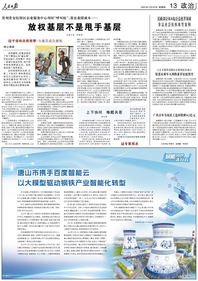5月29日,人民日報以《唐山市攜手百度智能云 以大模型驅動鋼鐵產業智能化轉型》為題,聚焦高新區“鳳凰智谷”,為企業提供全方位大模型技術支持,以大模型賦能千行百業,促進實體經濟和數字經濟深度融合?,F將原文轉載如下: