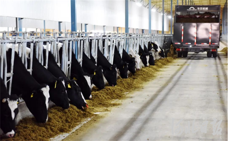 石家莊君樂(lè)寶乳業(yè)有限公司牧場(chǎng),戴著智能項(xiàng)圈的奶牛正在吃著科學(xué)配比的飼料。