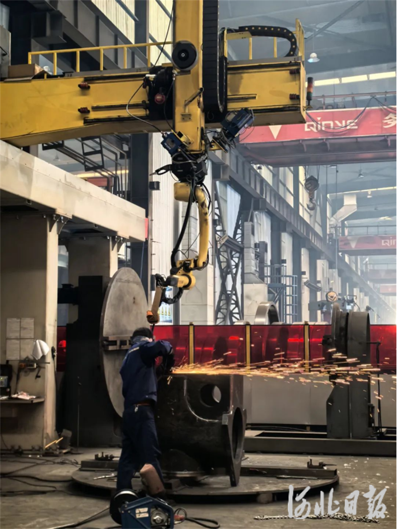在秦冶重工爐頂裝配區(qū),“競(jìng)爭(zhēng)在市場(chǎng),競(jìng)爭(zhēng)力在現(xiàn)場(chǎng)”的白底紅字標(biāo)語(yǔ)高懸在風(fēng)險(xiǎn)告知卡上方,一片熱火朝天的制造天地展現(xiàn)在眼前。身穿深藍(lán)工裝的裝配工正在機(jī)械臂的幫助下完成切割工作。氬弧焊槍燃起的弧光中,工人的安全帽檐明暗交替。