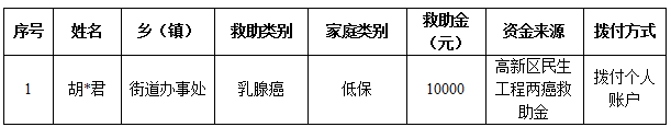 救助對象確定標準:本次救助對象范圍為摸排報送的經民政或鄉村振興部門認定的特困人員、低保對象、易返貧致貧人口、支出型困難人口(指因病因災因意外事故等剛性支出較大或收入大幅縮減導致基本生活出現嚴重困難人口)中,且經過有診斷資質的醫療機構確診、患有宮頸浸潤癌IIB以上或乳腺浸潤癌的婦女,救助標準為每人一次性救助 10000 元人民幣。