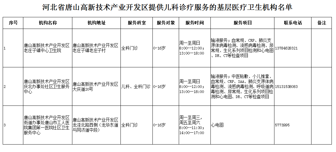高新區提供兒科診療服務的基層醫療衛生機構名單