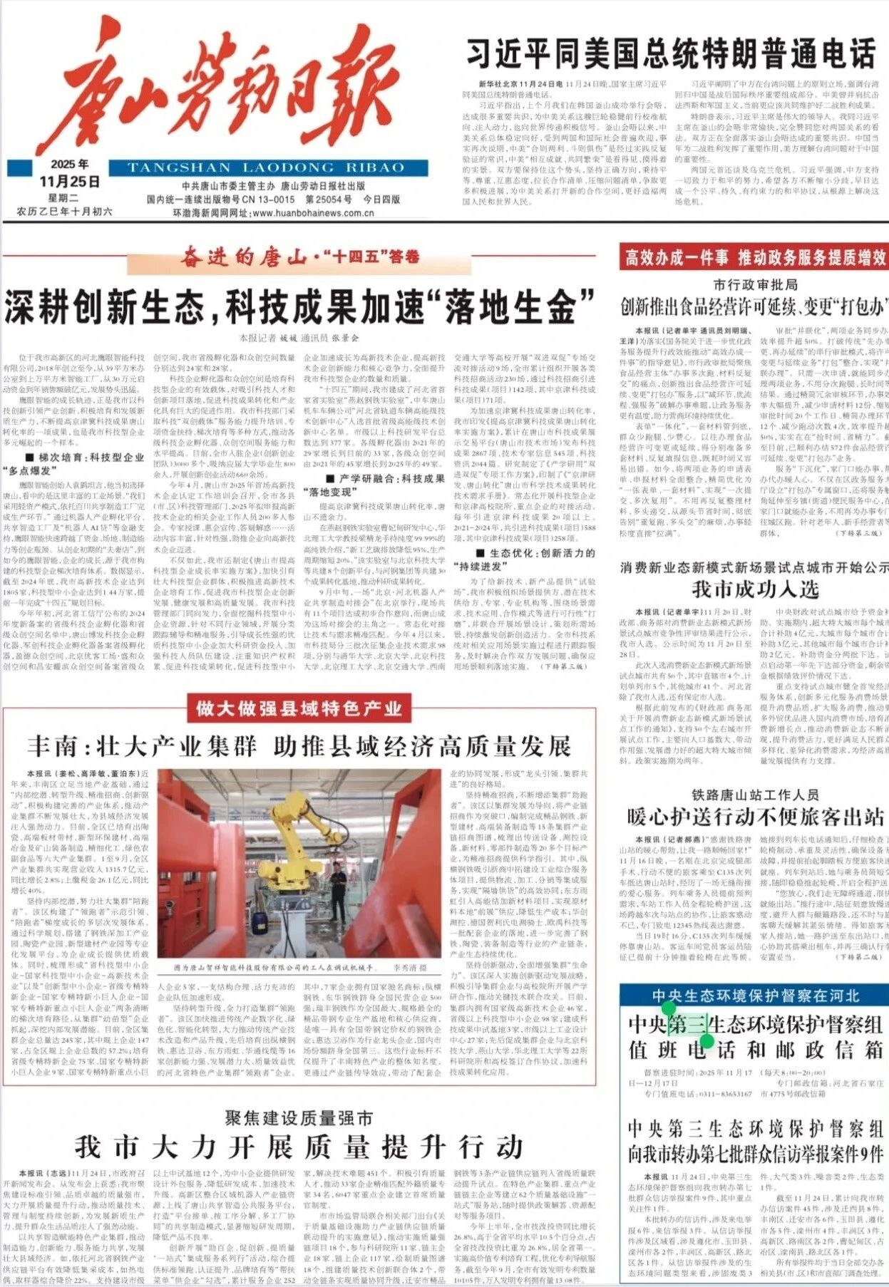 日前,《唐山勞動日報》頭版頭條以《深耕創(chuàng)新生態(tài),科技成果加速“落地生金”》為題,聚焦唐山高新區(qū)以科技創(chuàng)新引領(lǐng)產(chǎn)業(yè)創(chuàng)新、積極培育和發(fā)展新質(zhì)生產(chǎn)力,不斷提高京津冀科技成果唐山轉(zhuǎn)化率?,F(xiàn)將原文轉(zhuǎn)載如下: