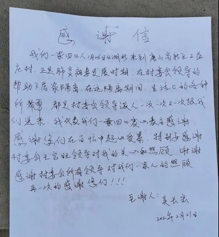 提到隔離戶,疫情當前,“湖北”多么敏感的字眼。王寶旺所分小組其中就有四口人是湖北來的人員。多少人避而不及,可是他勇敢面對,毫不退縮,為別人不敢為,為別人不愿為。他是“心理疏導員”,對因為被隔離而產生巨大心理壓力的隔離戶及時進行心理疏導。他是“愛心快遞小哥”在交通不便的情況下頂住壓力,風雪無阻,徒步為不能出門的“湖北”隔離戶送生活日用品, 工作繁重,壓力大。有人問他怕不怕?他卻說:“總要有人要站出來。”有人問他累不累?他笑笑說:“沒啥,不累,挺挺就過去了”。不善言辭的他,其實從防控疫情開展以來,這大半個月,一天都沒有休息過,卻沒有一句怨言。大家看在眼里,感動在心。隔離戶村民為感謝他這么多天悉心照顧,為他親手寫了感謝信。