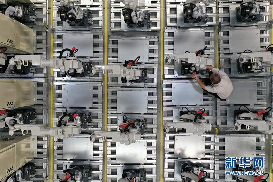 7月8日,唐山松下產業機器有限公司的工人在查看電焊機器人產品信息(無人機照片)。 新華社記者 牟宇 攝
