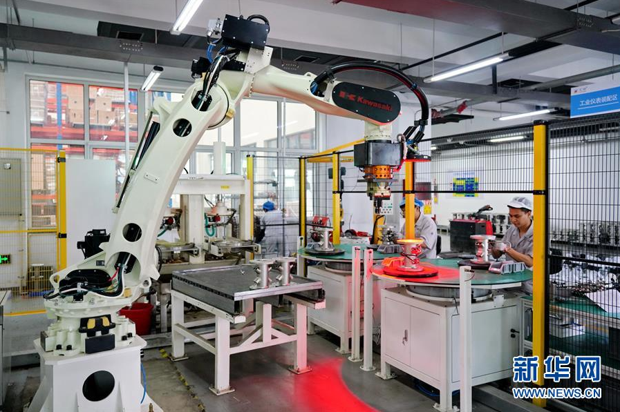 7月7日,唐山匯中儀表有限公司的機器人在搬運精密儀表部件。新華社記者 牟宇 攝