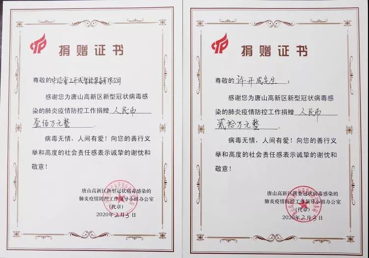 中信重工開誠智能公司捐贈100萬元,公司董事長許開成又以個人名義捐贈20萬元。許開成董事長表示,作為高新區企業,就是要與高新區攜手前行,風雨與共,合力打贏這場“戰役”。