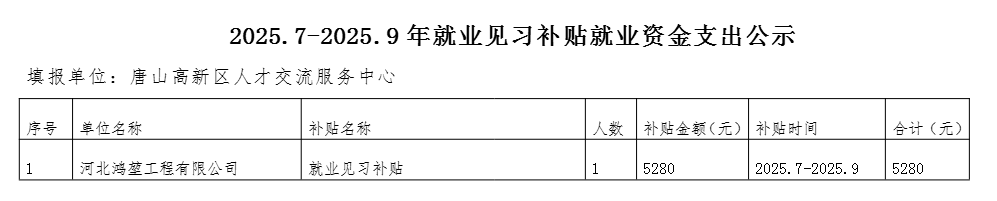 河北鴻堃工程有限公司接收1名畢業2年內高校畢業生參加就業見習,申請就業見習補貼5280元,從就業補助資金列支。