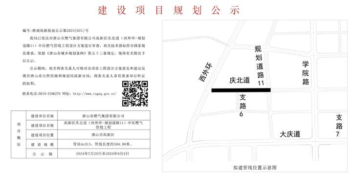 建設項目規劃公示(唐規高新批前公示第2024[021]號)