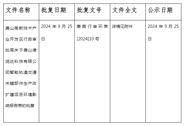 關于唐山德潤達科技有限公司智能軌道交通關鍵部件生產改擴建項目環境影響評價文件的審批決定公示