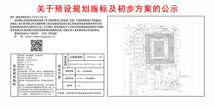 關于預設規劃指標及初步方案的公示-編號唐規高新批前公示2025(019)號