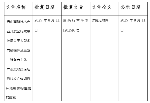 關(guān)于大型多向模鍛件及重型裝備自主化產(chǎn)業(yè)基地建設(shè)項(xiàng)目技改升級(jí)項(xiàng)目環(huán)境影響評(píng)價(jià)文件的審批決定公示