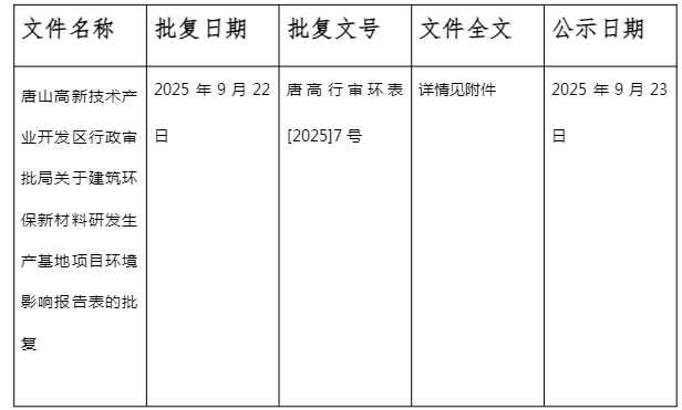 關于建筑環保新材料研發生產基地項目環境影響評價文件的審批決定公示