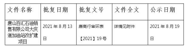 關于唐山百匯石油銷售有限公司大慶道加油站改擴建項目環境影響評價文件的審批決定公示