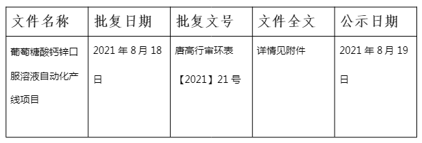 關于葡萄糖酸鈣鋅口服溶液自動化產線項目環境影響評價文件的審批決定公示