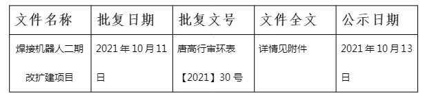關(guān)于焊接機(jī)器人二期改擴(kuò)建項(xiàng)目環(huán)境影響評(píng)價(jià)文件的審批決定公示