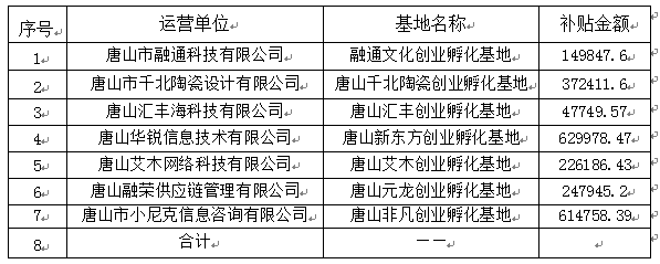 按照《唐山市財(cái)政局唐山市人力資源和社會(huì)保障局關(guān)于落實(shí)冀財(cái)社〔2018〕21號(hào)文件的通知》(唐財(cái)社〔2019〕1號(hào))規(guī)定,經(jīng)對(duì)高新區(qū)7家創(chuàng)業(yè)孵化基地房租物業(yè)水電費(fèi)申報(bào)材料進(jìn)行審核,同時(shí)根據(jù)唐山中頤達(dá)資產(chǎn)評(píng)估有限公司對(duì)該基地地價(jià)、設(shè)備投入、租金等方面的綜合評(píng)估,共需從就業(yè)扶持資金中支出¥2288877.26元,現(xiàn)將補(bǔ)貼情況進(jìn)行公示,公示期為3天,公示期內(nèi)如有異議,請(qǐng)向唐山高新區(qū)人力資源和社會(huì)保障局人才交流中心反映。