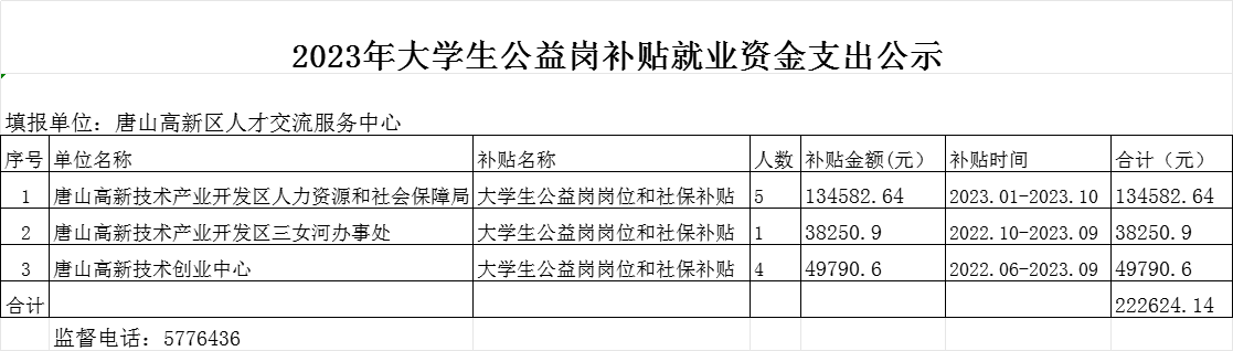2023年大學生公益崗補貼就業(yè)資金支出公示(人社局)