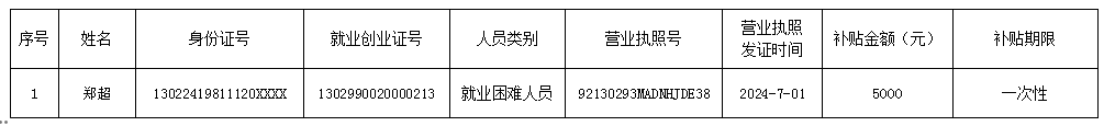 根據《唐山市人力資源和社會保障局、唐山市財政局關于印發<唐山市就業補助資金管理辦法>的通知》(唐財規〔2019〕1號)規定:畢業學年高校生及畢業5年內高校畢業生、就業困難人員初次創業、取得營業執照、登記就業(畢業學年高校生除外)、正常運營6個月以上的,給予一次性創業補貼,補貼標準為每個創業項目5000 元。現將補貼情況公示,待公示到期后發放至個人賬戶,監督電話:5776424。