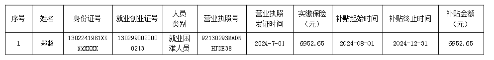 根據《唐山市人力資源和社會保障局、唐山市財政局關于印發<唐山市就業補助資金管理辦法>的通知》(唐財規〔2019〕1號)規定:初次創業人員的社會保險補貼,畢業5年內的高校畢業生、就業困難人員和去產能企業失業人員,初次創業領取營業執照(包括從事個體經營或創辦小微企業和在民政部門注冊的社會組織,除國家限定行業外,下同)、登記就業、正常經營6個月以上且繳納社會保險費的,按實際繳納的社會保險費給予補貼,補貼期限最長不超過3年。每人只能享受一次,以上符合條件靈活就業人員和初次創業人員社會保險補貼的繳費基數最高不超過社會平均工資。現將補貼情況進行公示,公示日期為2025年6月24日至2025年6月27日,待公示到期后發放至個人賬戶,監督電話:5776176。