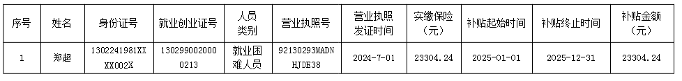 根據《唐山市人力資源和社會保障局、唐山市財政局關于印發<唐山市就業補助資金管理辦法>的通知》(唐財規〔2019〕1號)規定:初次創業人員的社會保險補貼,畢業5年內的高校畢業生、就業困難人員和去產能企業失業人員,初次創業領取營業執照(包括從事個體經營或創辦小微企業和在民政部門注冊的社會組織,除國家限定行業外,下同)、登記就業、正常經營6個月以上且繳納社會保險費的,按實際繳納的社會保險費給予補貼,補貼期限最長不超過3年。每人只能享受一次,以上符合條件靈活就業人員和初次創業人員社會保險補貼的繳費基數最高不超過社會平均工資。現將補貼情況進行公示,公示日期為2025年12月4日至2025年12月8日,待公示到期后發放至個人賬戶,監督電話:5776176。