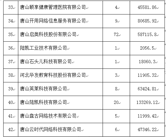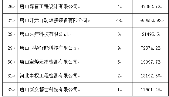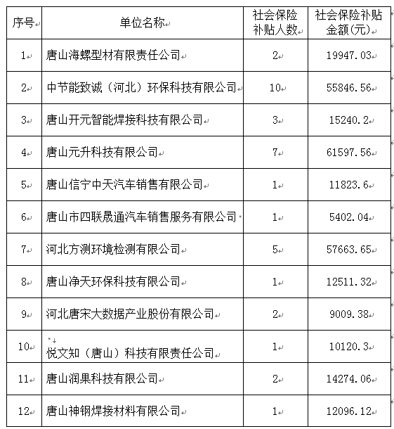 經審核唐山海螺型材有限責任公司、中節能致誠(河北)環保科技有限公司、唐山開元智能焊接科技有限公司等42家中小微企業申報的吸納高校畢業生社保補貼符合政策要求,現予以公示,待公示到期后發放至公司對公賬戶,監督電話:5776175。