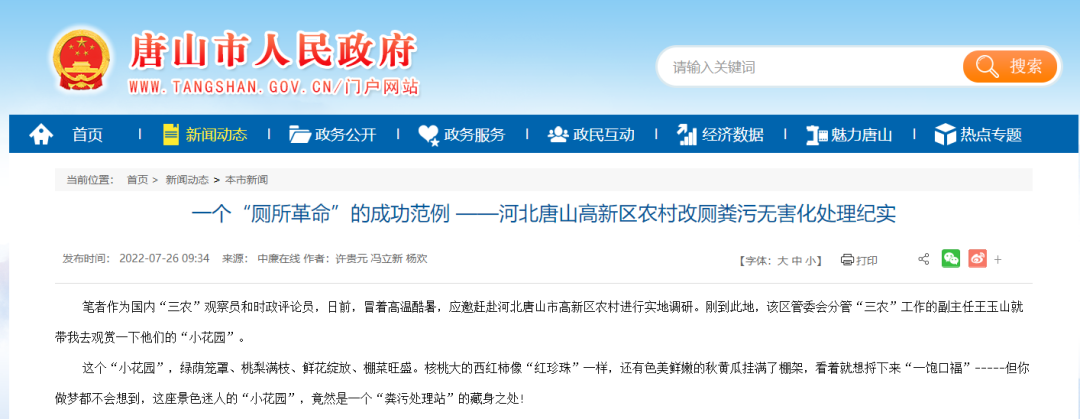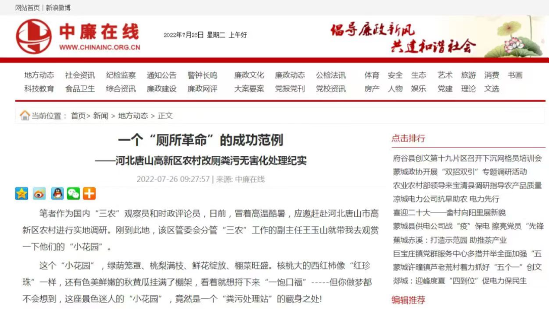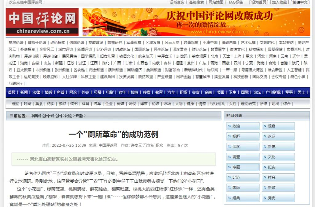 日前,國內(nèi)著名評論員、全國“三農(nóng)”問題觀察員許貴元深入唐山高新區(qū)農(nóng)村調(diào)研后撰寫的題為《一個“廁所革命”的成功范例——河北唐山高新區(qū)農(nóng)村改廁糞污無害化處理紀實》的長篇新聞通訊,先后被中國評論網(wǎng)、神州瞭望網(wǎng)、中廉在線、中國環(huán)衛(wèi)科技網(wǎng)、中廉導刊、搜狐網(wǎng)、網(wǎng)易、唐山市人民政府網(wǎng)等多家中央國家和地方權(quán)威媒體播發(fā)和轉(zhuǎn)載,迅速覆蓋神州大地,把唐山高新區(qū)在開展“廁所革命”中的創(chuàng)新做法和基本經(jīng)驗推向了全國,給全區(qū)廣大干部群眾以極大鼓舞和激勵!