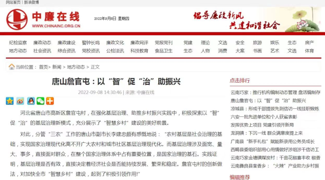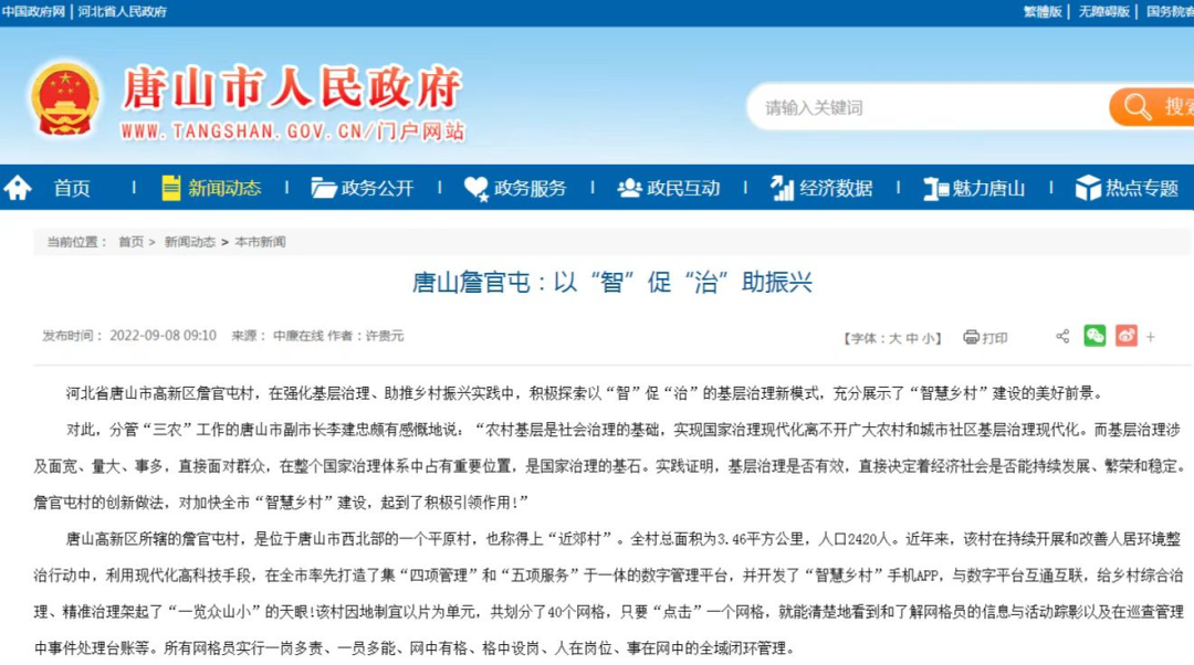河北省唐山市高新區詹官屯村,在強化基層治理、助推鄉村振興實踐中,積極探索以“智”促“治”的基層治理新模式,充分展示了“智慧鄉村”建設的美好前景。