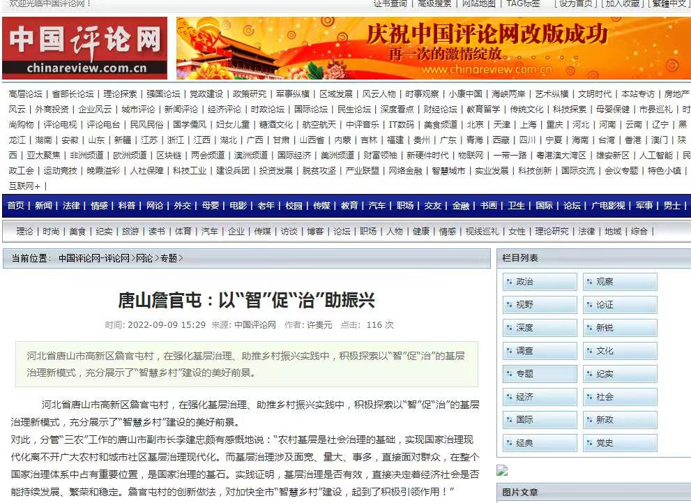 日前,國內著名評論員、全國“三農”問題觀察員許貴元先后兩次深入實地調研觀摩后,及時撰寫了題為《唐山詹官屯:以“智”促“治”助振興》的新聞通訊,被神州瞭望網、中國評論網、中廉在線和唐山市政府網站等多家中央國家和地方權威媒體播發和轉載。文章簡要總結了詹官屯村傾力打造“智慧鄉村”,助推鄉村振興的基本經驗和做法,對各地農村強化基層治理,具有一定的指導性。