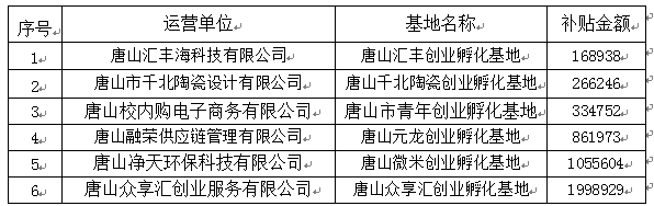 按照《唐山市財政局唐山市人力資源和社會保障局關于落實冀財社〔2018〕21號文件的通知》(唐財社〔2019〕1號)規定,經對高新區6家創業孵化基地房租物業水電費申報材料進行審核,同時根據河北永安資產評估有限公司對該基地地價、設備投入、租金等方面的綜合評估,共需從就業扶持資金中支出¥4686442元,現將補貼情況進行公示,公示期為3天,公示期內如有異議,請向唐山高新區人力資源和社會保障局人才交流中心反映。