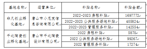 按照《唐山市人民政府辦公室關(guān)于印發(fā)唐山市創(chuàng)業(yè)孵化基地管理辦法的通知》(唐政辦發(fā)〔2019〕4號(hào))、《唐山市人力資源和社會(huì)保障局、唐山市財(cái)政局關(guān)于規(guī)范創(chuàng)業(yè)就業(yè)孵化基地公共服務(wù)場地房租補(bǔ)貼的通知》(唐人社字〔2020〕189號(hào))、《唐山市人民政府辦公室關(guān)于印發(fā)唐山市創(chuàng)業(yè)孵化基地管理辦法的通知》(唐政辦發(fā)〔2022〕109號(hào))規(guī)定,經(jīng)人社、財(cái)政部門認(rèn)定的創(chuàng)業(yè)孵化基地可享受以下扶持政策:孵化基地提供正常服務(wù),入駐孵化基地的創(chuàng)業(yè)項(xiàng)目正常運(yùn)行滿6個(gè)月的,可按照市場評(píng)估成本價(jià)給予孵化基地最長不超過3年的場地租賃補(bǔ)貼。經(jīng)對唐山非凡創(chuàng)業(yè)孵化基地、唐山千北陶瓷創(chuàng)業(yè)孵化基地的場地租賃補(bǔ)貼申報(bào)材料進(jìn)行審核,同時(shí)根據(jù)唐山金恒房地產(chǎn)評(píng)估有限公司評(píng)估報(bào)告對上述2家基地地價(jià)、設(shè)備投入、租金等方面的綜合評(píng)估,共需從創(chuàng)業(yè)扶持資金中支出2368561元。現(xiàn)將補(bǔ)貼情況進(jìn)行公示,公示期為3天,公示期內(nèi)如有異議,請向唐山高新區(qū)人力資源和社會(huì)保障局人才交流中心反映,聯(lián)系電話5776173。?