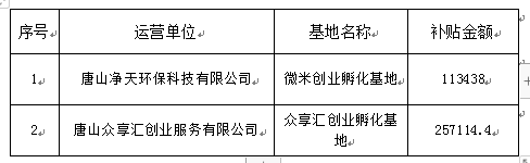 按照《唐山市財政局唐山市人力資源和社會保障局關于落實冀財社〔2018〕21號文件的通知》(唐財社〔2019〕1號)規定,經對高新區2家創業孵化基地房租物業水電費申報材料進行審核,同時根據唐山金恒房地產評估有限公司對該基地地價、設備投入、租金等方面的綜合評估,共需從就業扶持資金中支出¥370552.4元,現將補貼情況進行公示,公示期為3天,公示期內如有異議,請向唐山高新區人力資源和社會保障局人才交流中心反映。