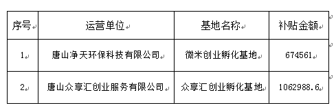按照《唐山市財政局唐山市人力資源和社會保障局關于落實冀財社〔2018〕21號文件的通知》(唐財社〔2019〕1號)規(guī)定,經對高新區(qū)2家創(chuàng)業(yè)孵化基地房租物業(yè)水電費申報材料進行審核,同時根據(jù)唐山金恒房地產評估有限公司對該基地地價、設備投入、租金等方面的綜合評估,共需從就業(yè)扶持資金中支出¥1737549.6元,現(xiàn)將補貼情況進行公示,公示期為3天,公示期內如有異議,請向唐山高新區(qū)人力資源和社會保障局人才交流中心反映。