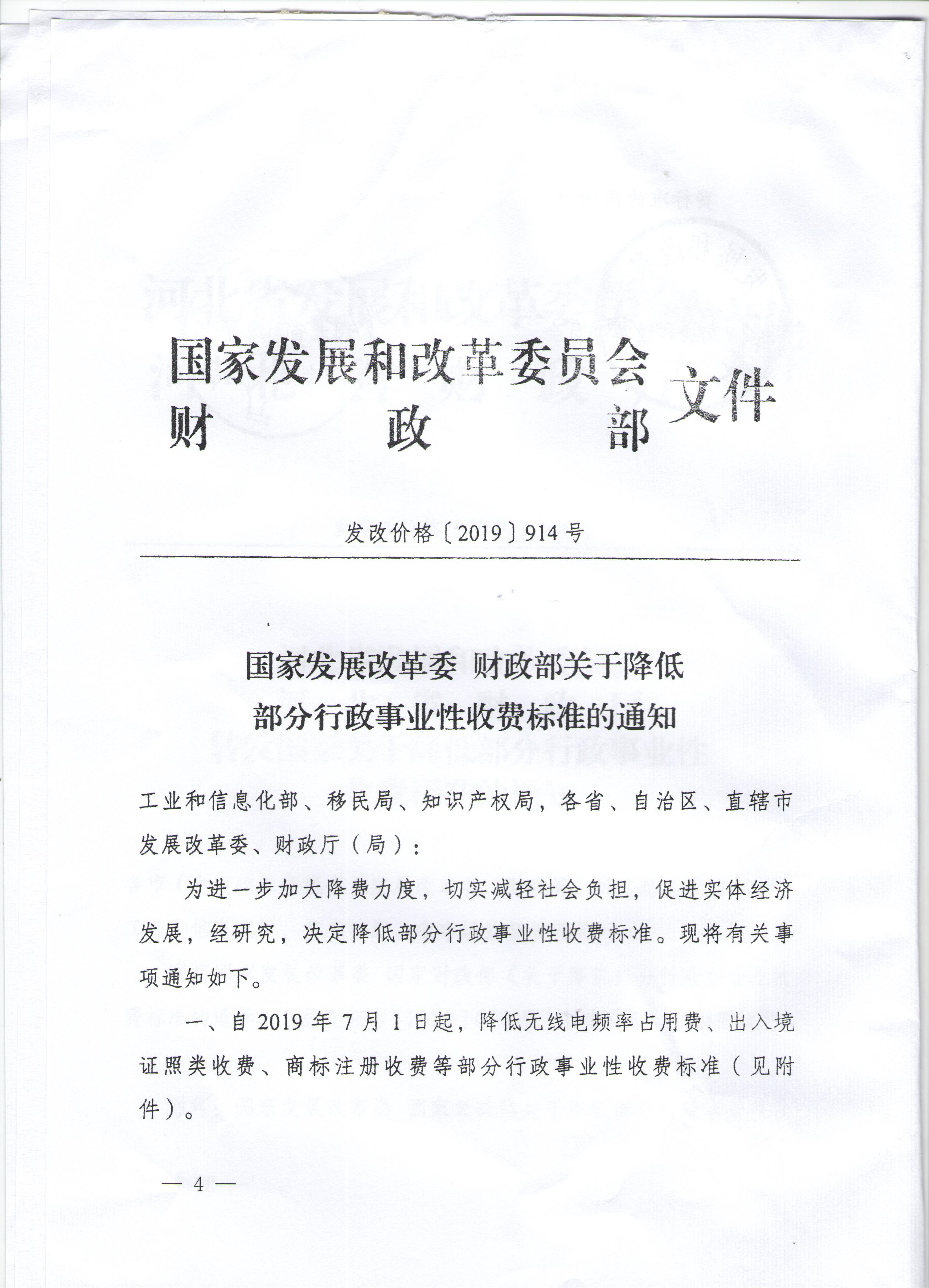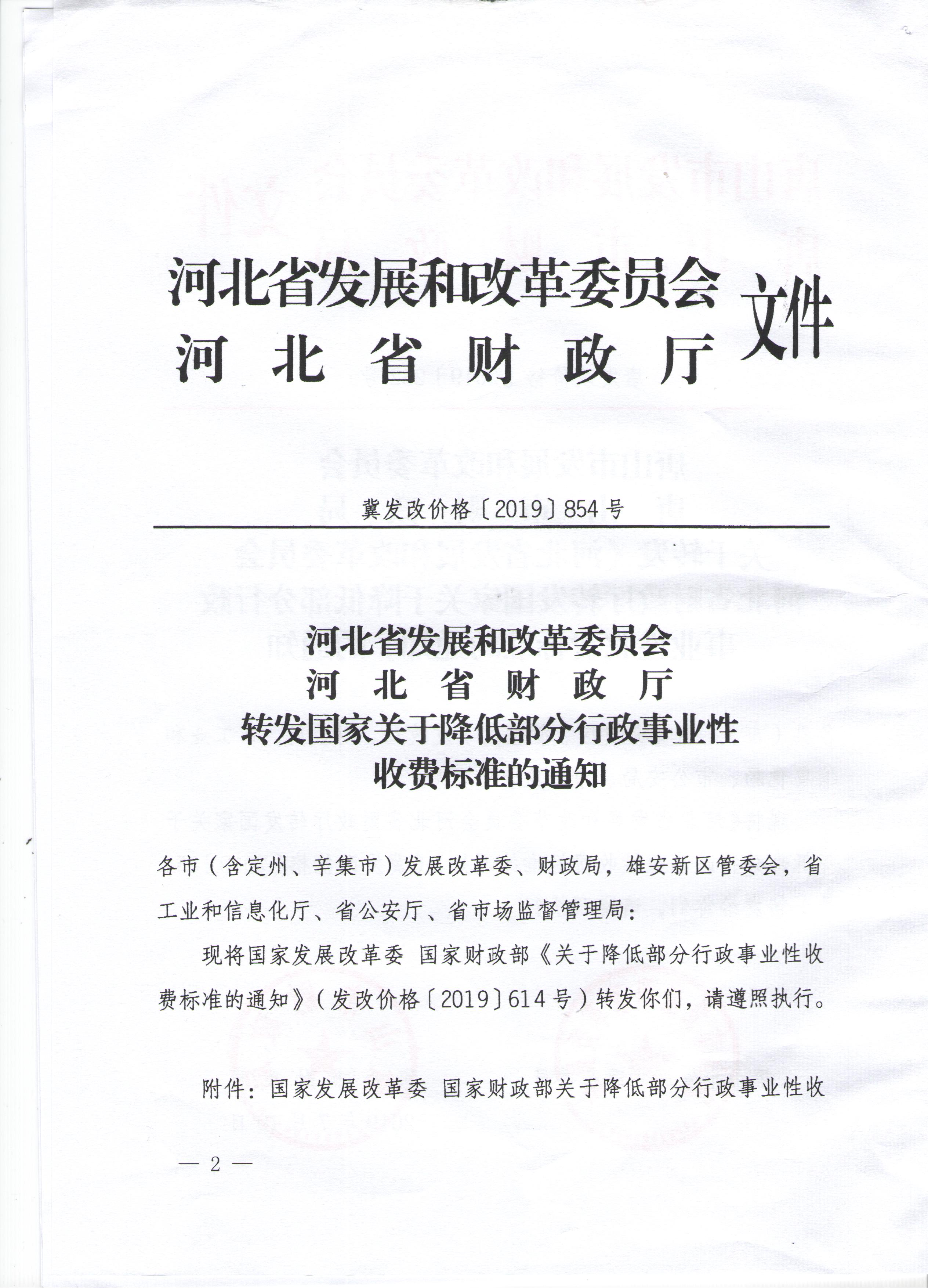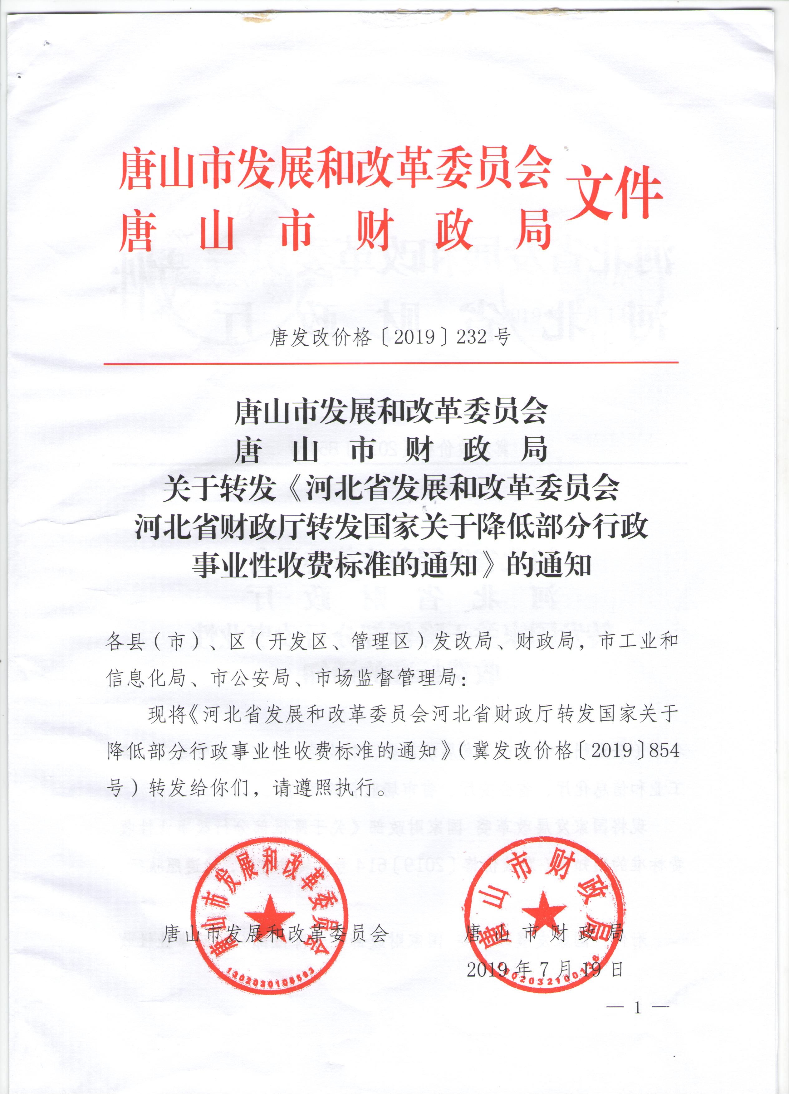 現轉發唐山市發改委唐山市財政局關于轉發《河北省發展和改革委員會河北省財政廳轉發國家關于降低部分行政事業性收費標準的通知》(唐發改價格〔2019〕232號)。