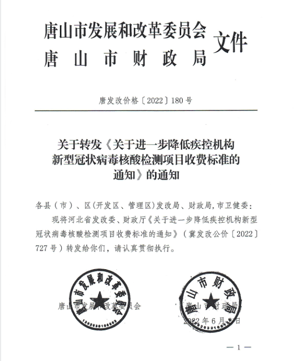 現轉發《唐山市發展和改革委員會關于轉發<關于進一步降低疾控機構新型冠狀病毒核酸檢測項目收費標準的通知>的通知》(唐發改價格〔2022〕180號)