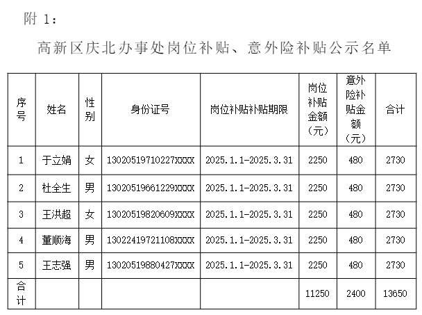 附件1:高新區(qū)慶北辦事處崗位補貼、意外險補貼公示名單