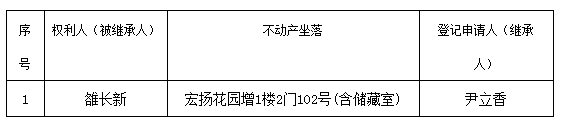 根據(jù)《不動(dòng)產(chǎn)登記暫行條例實(shí)施細(xì)則》第十四條的規(guī)定,經(jīng)初步查驗(yàn),不動(dòng)產(chǎn)登記機(jī)構(gòu)擬對(duì)下列不動(dòng)產(chǎn)權(quán)利辦理不動(dòng)產(chǎn)繼承登記。根據(jù)《不動(dòng)產(chǎn)登記暫行條例實(shí)施細(xì)則》第十七條的規(guī)定,現(xiàn)予公告。如有異議,請(qǐng)自本公告之日起90個(gè)工作日內(nèi),將異議書(shū)面材料送達(dá)不動(dòng)產(chǎn)登記機(jī)構(gòu)。逾期無(wú)人提出異議或者異議不成立的,不動(dòng)產(chǎn)登記機(jī)構(gòu)將予以登記。