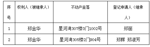 根據《不動產登記暫行條例實施細則》第十四條的規定,經初步查驗,不動產登記機構擬對下列不動產權利辦理不動產繼承登記。根據《不動產登記暫行條例實施細則》第十七條的規定,現予公告。如有異議,請自本公告之日起90個工作日內,將異議書面材料送達不動產登記機構。逾期無人提出異議或者異議不成立的,不動產登記機構將予以登記。