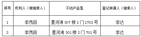 根據《不動產登記暫行條例實施細則》第十四條的規定,經初步查驗,不動產登記機構擬對下列不動產權利辦理不動產繼承登記。根據《不動產登記暫行條例實施細則》第十七條的規定,現予公告。如有異議,請自本公告之日起90個工作日內,將異議書面材料送達不動產登記機構。逾期無人提出異議或者異議不成立的,不動產登記機構將予以登記。