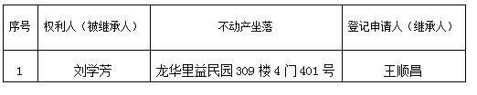 根據《不動產登記暫行條例實施細則》第十四條的規定,經初步查驗,不動產登記機構擬對下列不動產權利辦理不動產繼承登記。根據《不動產登記暫行條例實施細則》第十七條的規定,現予公告。如有異議,請自本公告之日起90個工作日內,將異議書面材料送達不動產登記機構。逾期無人提出異議或者異議不成立的,不動產登記機構將予以登記。