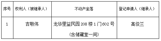 根據《不動產登記暫行條例實施細則》第十四條的規定,經初步查驗,不動產登記機構擬對下列不動產權利辦理不動產繼承登記。根據《不動產登記暫行條例實施細則》第十七條的規定,現予公告。如有異議,請自本公告之日起90個工作日內,將異議書面材料送達不動產登記機構。逾期無人提出異議或者異議不成立的,不動產登記機構將予以登記。