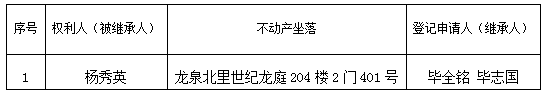 根據《不動產登記暫行條例實施細則》第十四條的規定,經初步查驗,不動產登記機構擬對下列不動產權利辦理不動產繼承登記。根據《不動產登記暫行條例實施細則》第十七條的規定,現予公告。如有異議,請自本公告之日起90個工作日內,將異議書面材料送達不動產登記機構。逾期無人提出異議或者異議不成立的,不動產登記機構將予以登記。