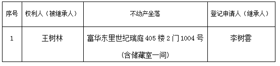 根據《不動產登記暫行條例實施細則》第十四條的規定,經初步查驗,不動產登記機構擬對下列不動產權利辦理不動產繼承登記。根據《不動產登記暫行條例實施細則》第十七條的規定,現予公告。如有異議,請自本公告之日起90個工作日內,將異議書面材料送達不動產登記機構。逾期無人提出異議或者異議不成立的,不動產登記機構將予以登記。