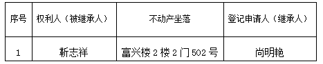 根據《不動產登記暫行條例實施細則》第十四條的規定,經初步查驗,不動產登記機構擬對下列不動產權利辦理不動產繼承登記。根據《不動產登記暫行條例實施細則》第十七條的規定,現予公告。如有異議,請自本公告之日起90個工作日內,將異議書面材料送達不動產登記機構。逾期無人提出異議或者異議不成立的,不動產登記機構將予以登記。