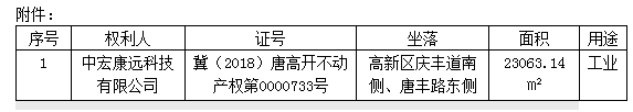 根據《唐山市自然資源和規劃局高新分局收回國有建設用地使用權決定書》(唐高資規閑收【2021】001號),唐山中宏康遠科技有限公司辦理的國有建設用地使用權證書【冀(2018)唐高開不動產權第0000733號】,已被依法注銷。根據《不動產登記暫行條例實施細則》第十七條的規定,現予以公告。如有異議,請自本公告發布之日起,十五個工作日內將異議材料送達我中心。逾期無人提異議或異議不成立的,我中心將予以注銷登記。